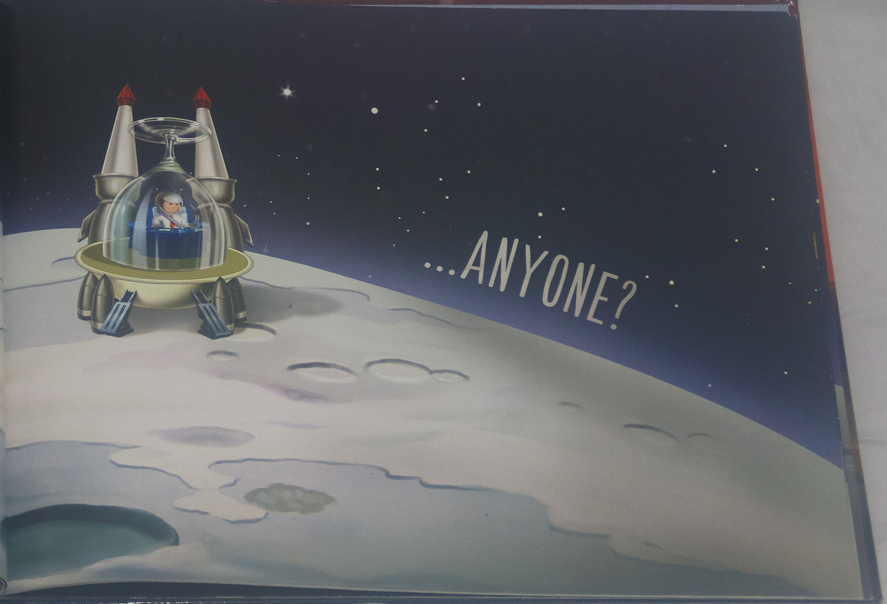 Pero nuestro pequeño astronauta pronto descubre que el polvo lunar no tiene ese aroma de kugel recién horneado, y ¿tratar de servir jugo de uva en gravedad cero? Bueno, digamos que no salió muy bien.