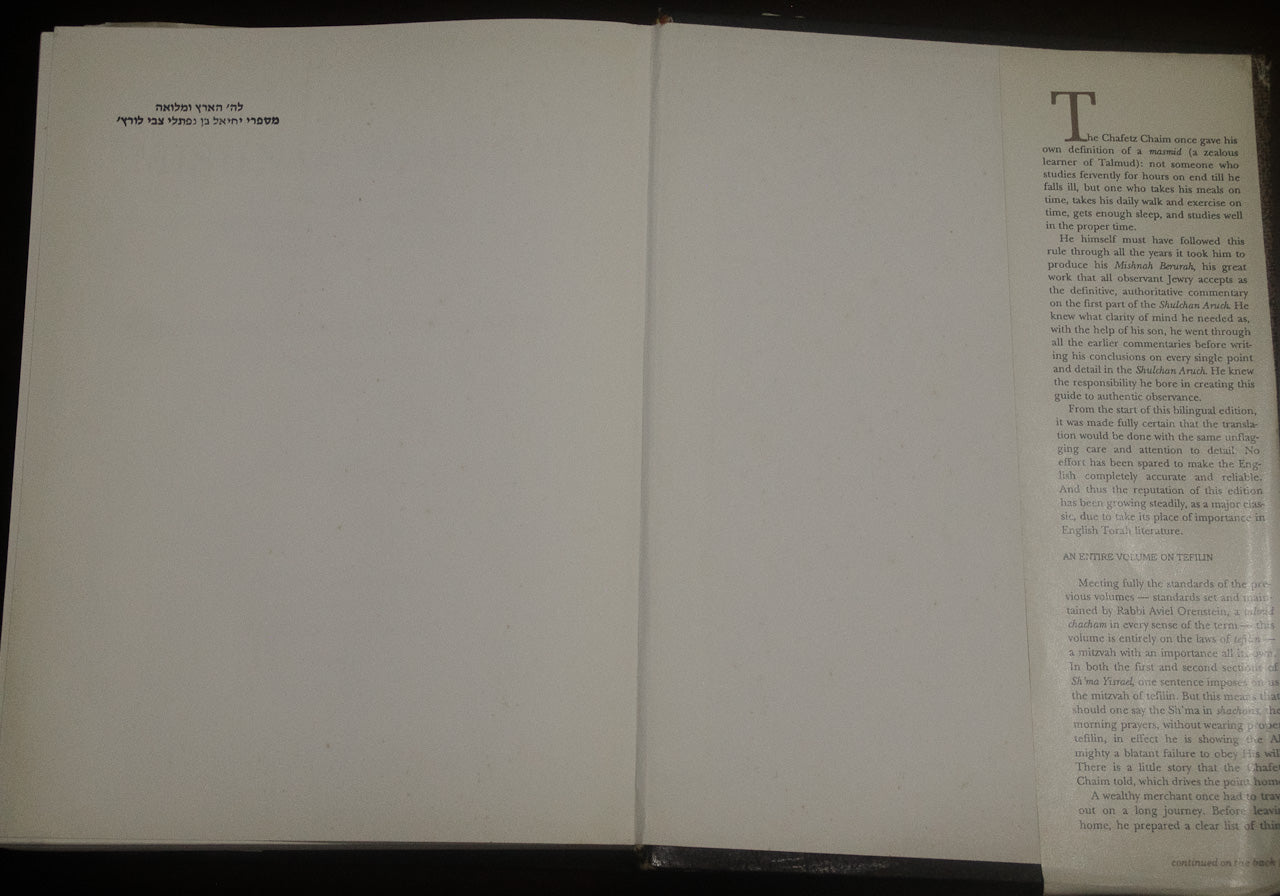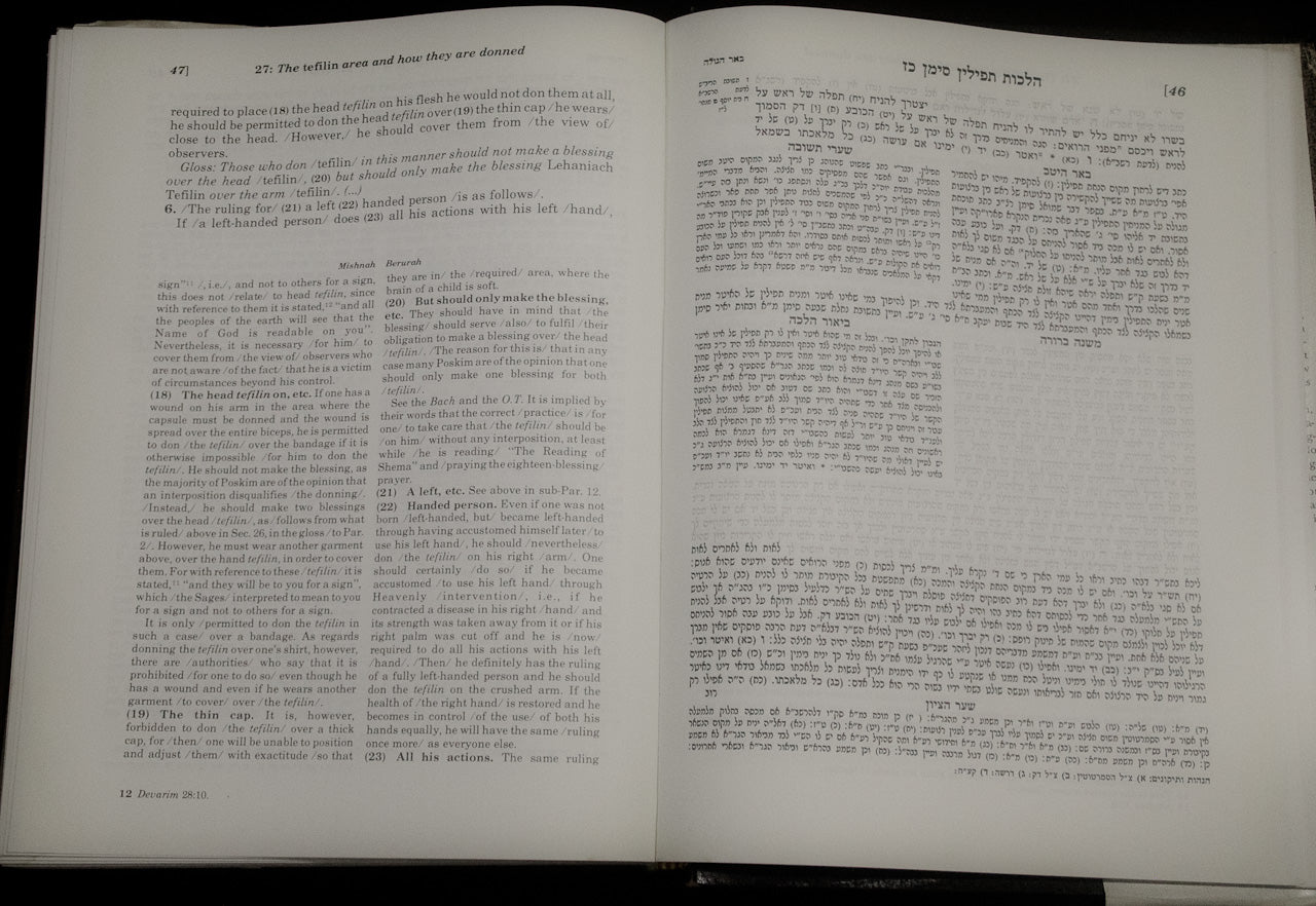 Este volumen del Mishná Berurá está dedicado específicamente a las leyes de los Tefilín, abarcando de manera sistemática y detallada los halajot fundamentales relacionadas con su colocación, uso y requisitos, conforme al Shulján Aruj Oraj Jaím. La obra presenta el texto original en hebreo acompañado de una traducción clara al inglés, facilitando un estudio profundo y preciso.